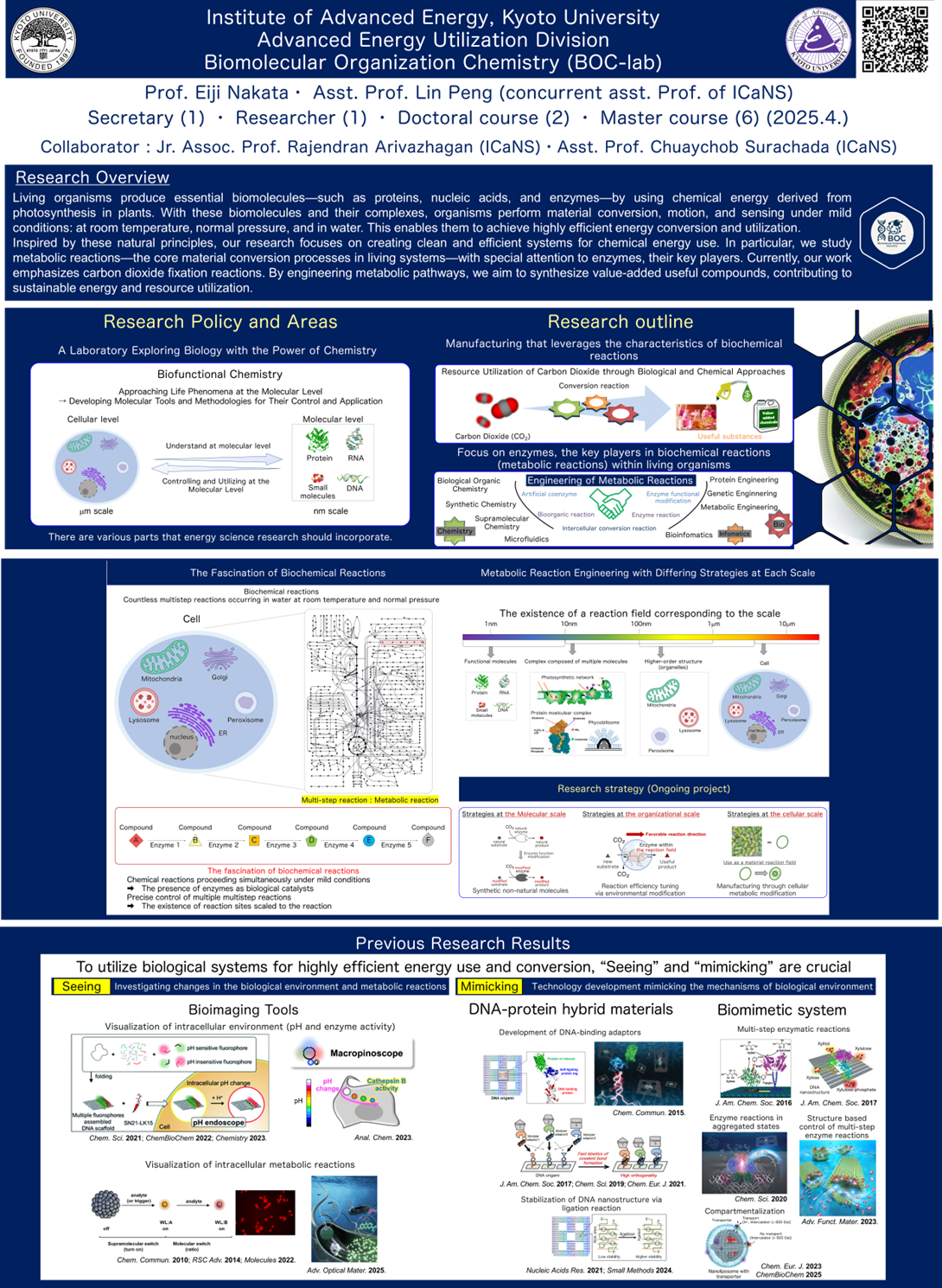 In our laboratory, we explore how living systems—especially enzymes—can inspire new ways of using energy. By organizing biomolecules for specific purposes, we aim to create innovative material conversion systems that actively use greenhouse gases, particularly carbon dioxide, as valuable resources. Through this biological approach, we strive to advance energy research that contributes to achieving a truly carbon-negative future.