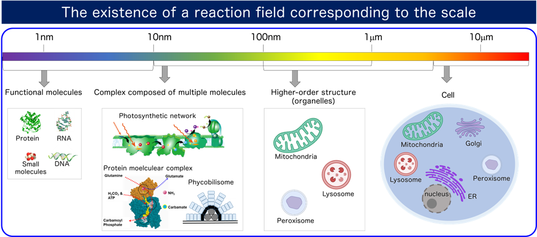 Furthermore, these chemical reactions are dynamically controlled and intricately interconnected through distinct “reaction sites” corresponding to different scales: from intramolecular (Å-nm scale) and intermolecular complexes (supramolecular structures) and higher-order assemblies (organelles) (nm-μm scale), to cells (μm scale), and individuals (mm-m scale).In other words, the excellence of biological energy utilization systems stems from the existence of reaction fields based on different strategies tailored to each scale.